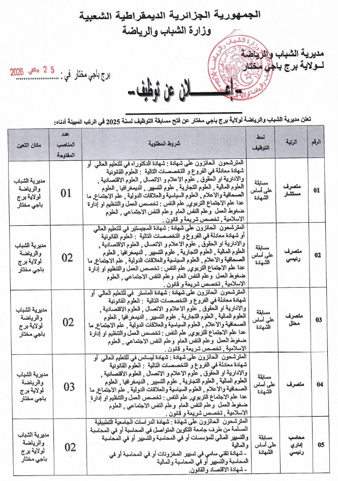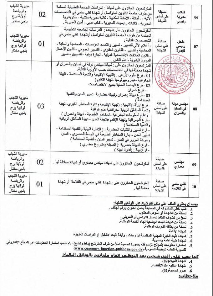تعلن مديرية الشباب والرياضة لولاية برج باجي مختار عن فتح مسابقة توظيف على أساس الشهادة في الرتب التالية: