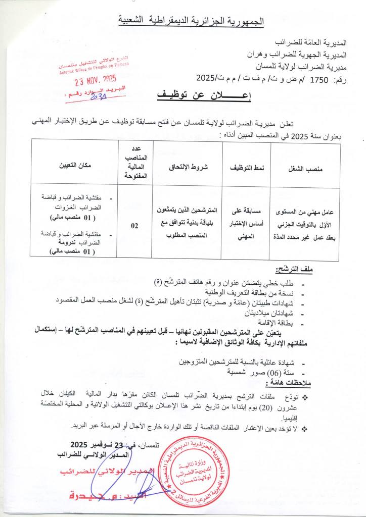 تعلن مديرية الضرائب لولاية تلمسان عن فتح مسابقة توظيف عن طريق الاختبار المهني بعنوان سنة 2025 للالتحاق بالرتبة المبينة أدناه: