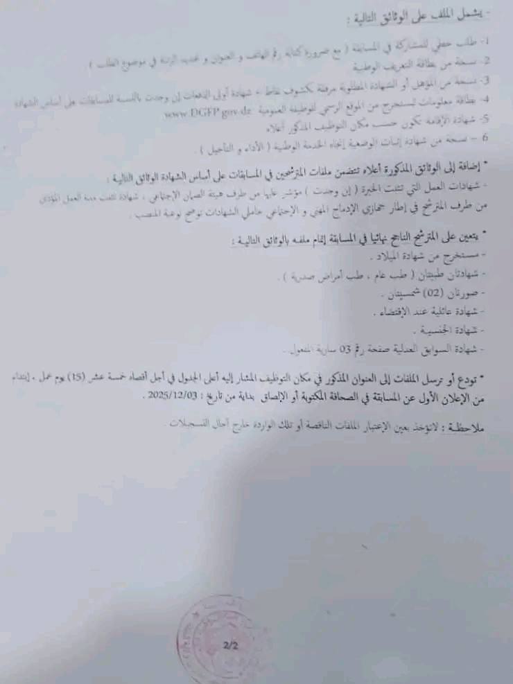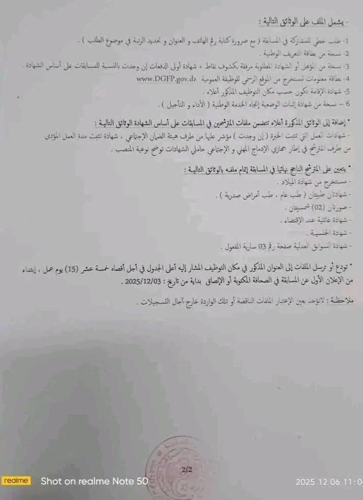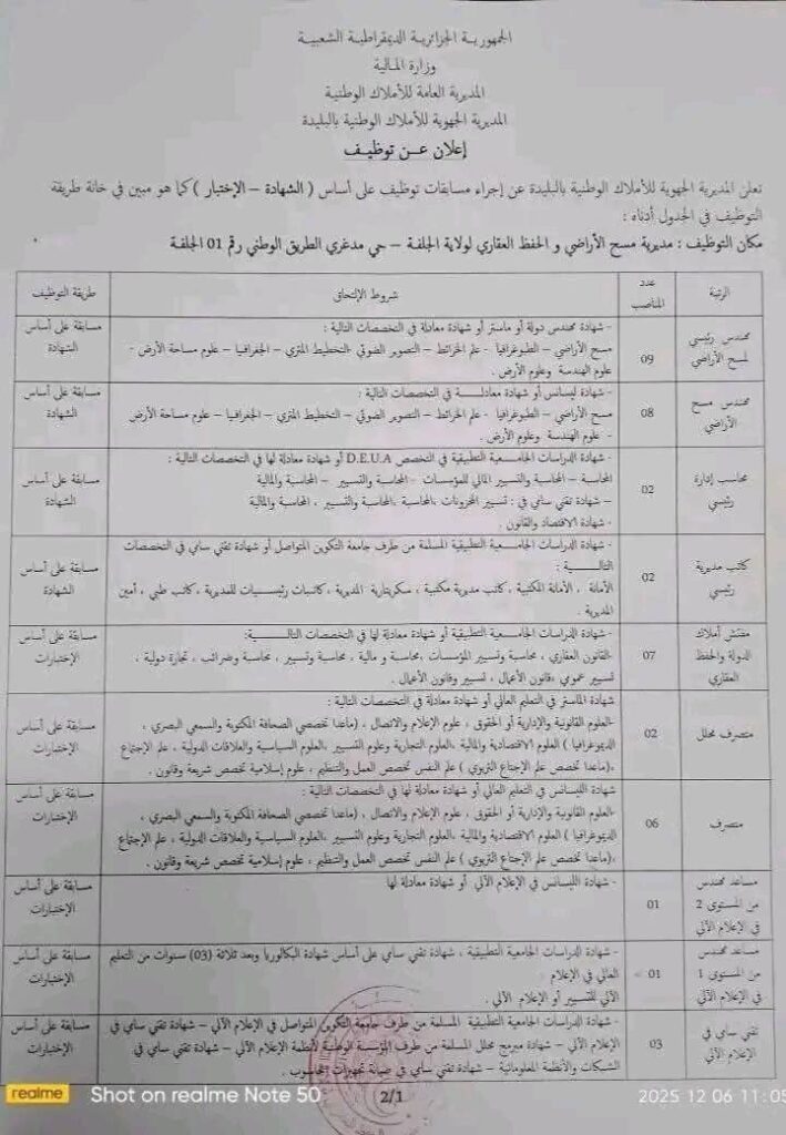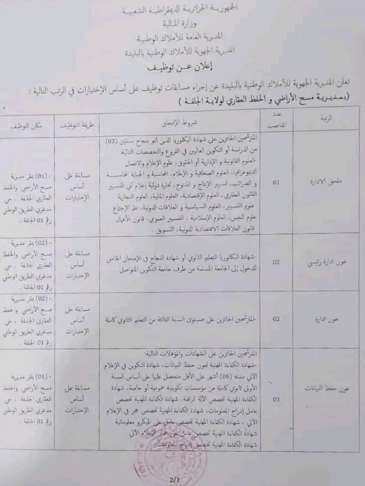 مديرية مسح الأراضي والحفظ العقاري لولاية الجلفة تعلن عن فتح مسابقات توظيف في الرتب التالية :