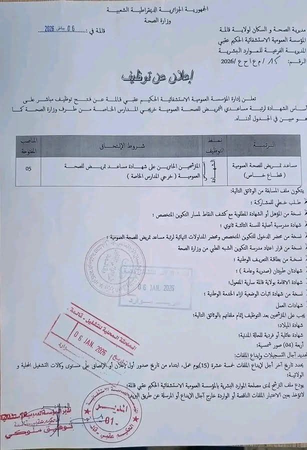 تعلن إدارة المؤسسة العمومية الاستشفائية الحكيم عقبي قالمة عن فتح توظيف مباشر على أساس الشهادة لرتبة مساعدي التمريض للصحة العمومية خريجي المدارس الخاصة من طرف وزارة الصحة كما هو مبين في الجدول أدناه: