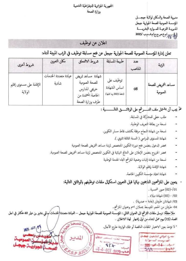 مساعد التمريض للصحة العمومية على أساس الشهادة 08 مناصب خريجو المدارس الخاصة المعتمدة من طرف وزارة الصحة، دفعة 2023 وما قبلها العيادات متعددة الخدمات عبر إقليم الولاية الإقامة على مستوى ولاية جيجل