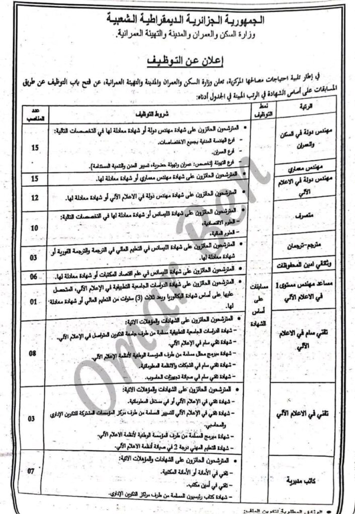 في إطار تلبية احتياجات مصالحها المركزية، تعلن وزارة السكن والعمران والمدينة والتهيئة العمرانية عن فتح مسابقات توظيف على أساس الشهادة في الرتب المبينة أدناه: