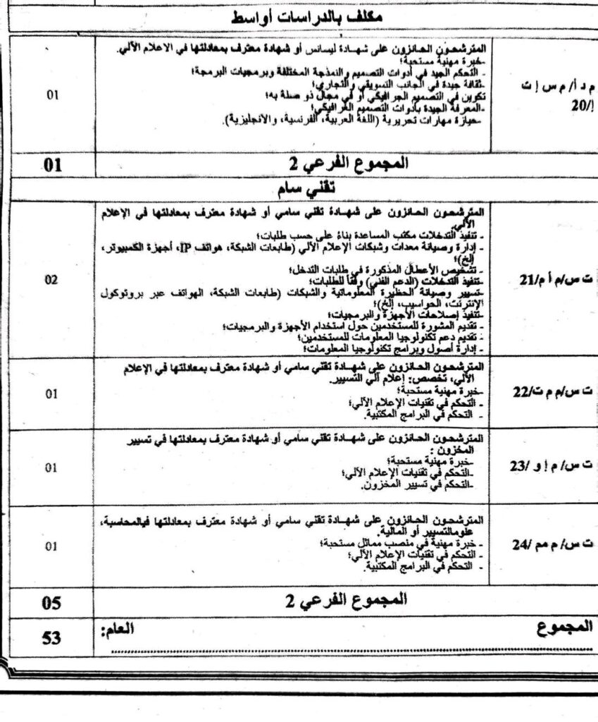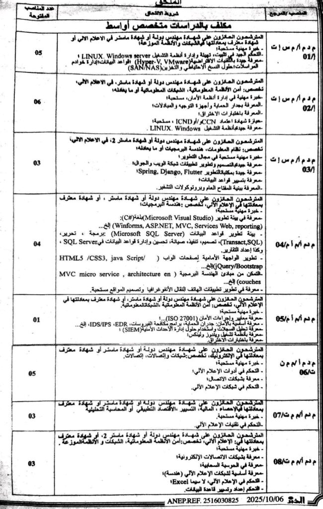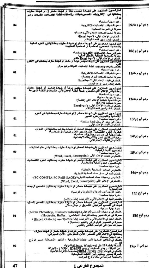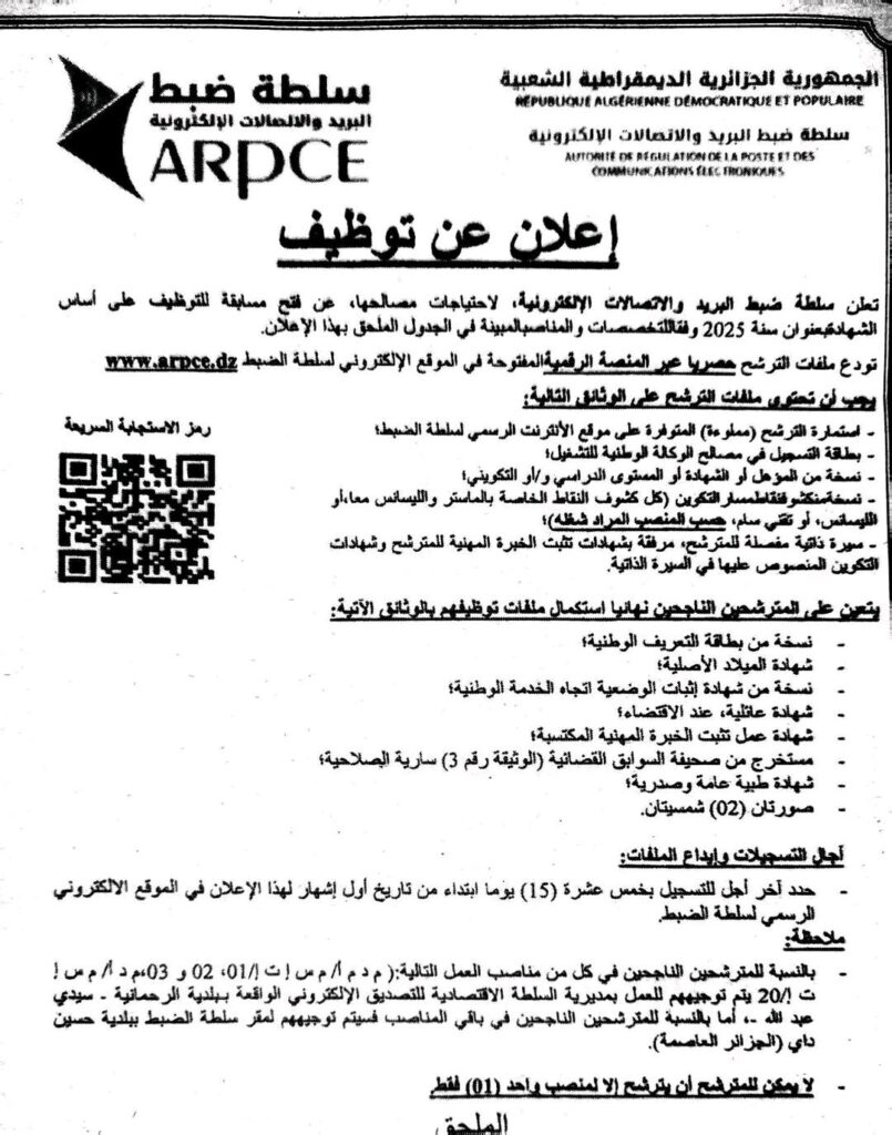 تعلن سلطة ضبط البريد والاتصالات الإلكترونية، لاحتياجات مصالحها، عن فتح مسابقة للتوظيف على أساس الشهادة بعنوان سنة 2025.