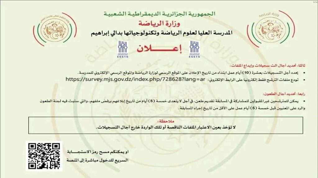 اعلان مسابقة على أساس الاختبارات بالمدرسة العليا لعلوم الرياضة والتكنولوجياتها للحائزين على شهادة البكالوريا