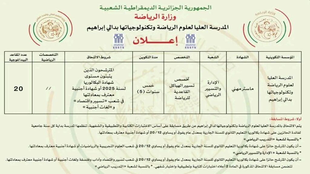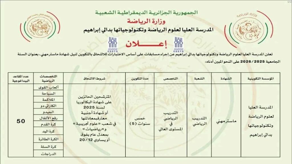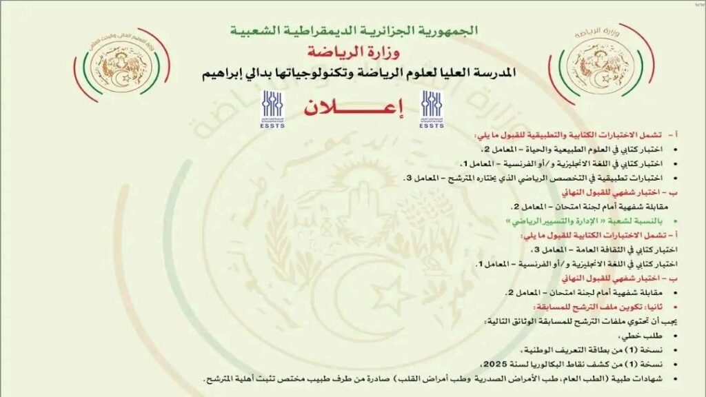 اعلان مسابقة على أساس الاختبارات بالمدرسة العليا لعلوم الرياضة والتكنولوجياتها للحائزين على شهادة البكالوريا