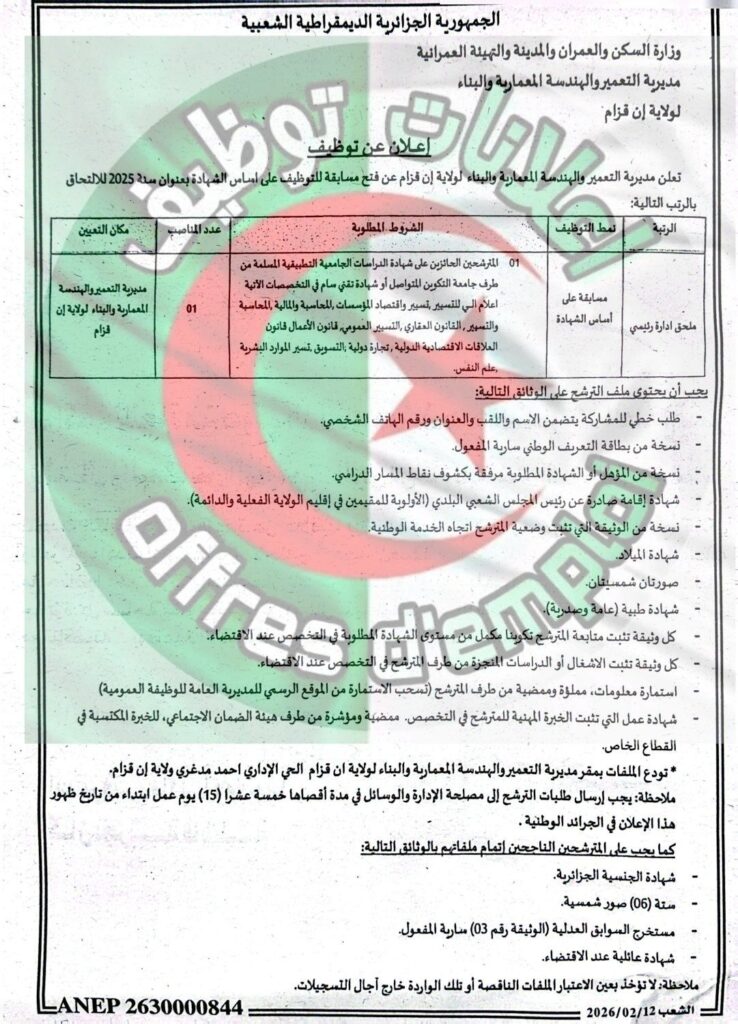 تعلن مديرية التعمير والهندسة المعمارية والبناء لولاية إن قزام عن فتح مسابقة للتوظيف على أساس الشهادة بعنوان سنة 2025 للالتحاق بالرتب التالية: