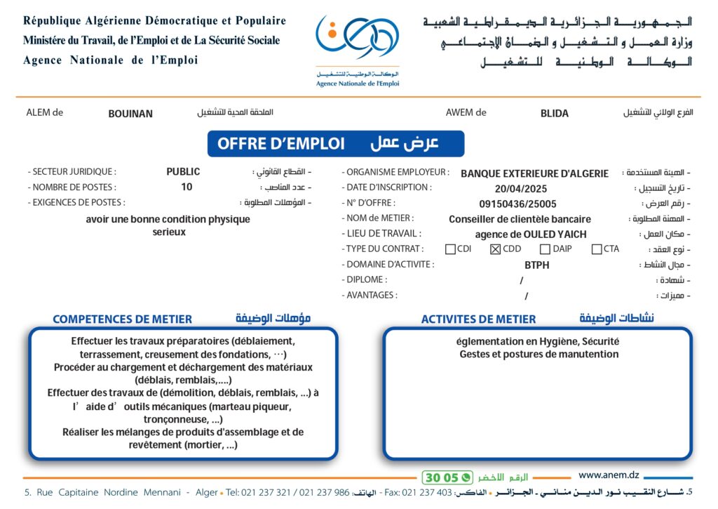 مكان العمل: وكالة أولاد يعيش – البليدة