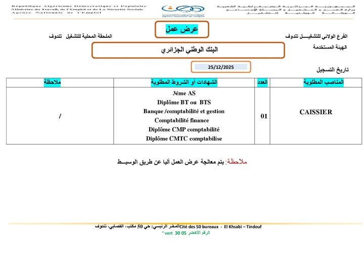| صراف (Caissier) | 01 | – السنة الثالثة ثانوي (3ème AS) – شهادة BT أو BTS في: • البنوك / المحاسبة والإدارة • المحاسبة المالية – شهادة CMP محاسبة – شهادة CMTC محاسبة |