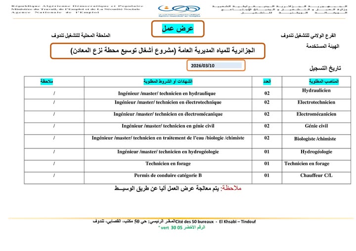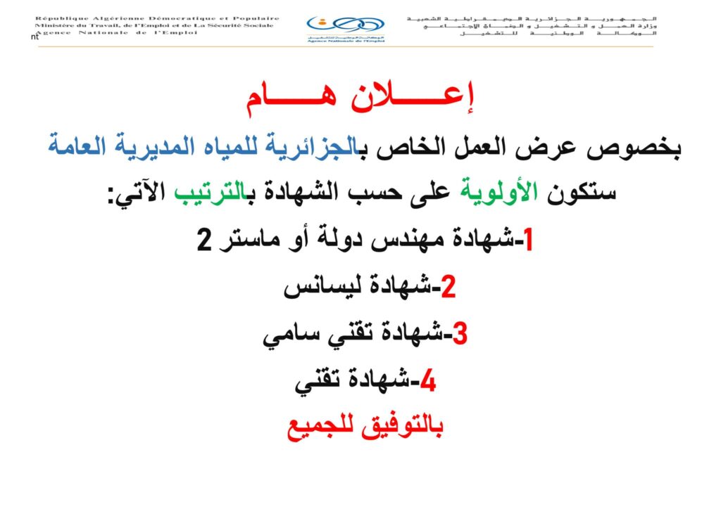 بخصوص عرض العمل الخاص بالجزائرية للمياه المديرية العامة: