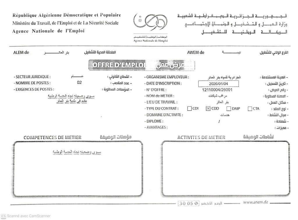 الهيئة المستخدمة: الجزائرية للمياه بئر العاتر