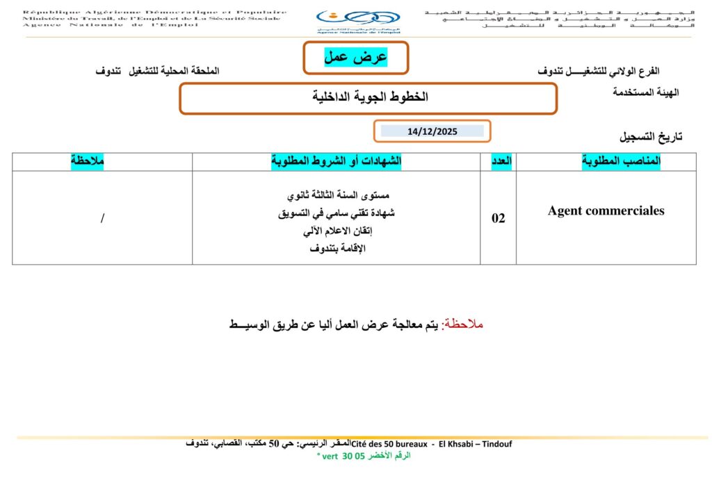 المنصب المطلوب Agent Commercial (عون تجاري)