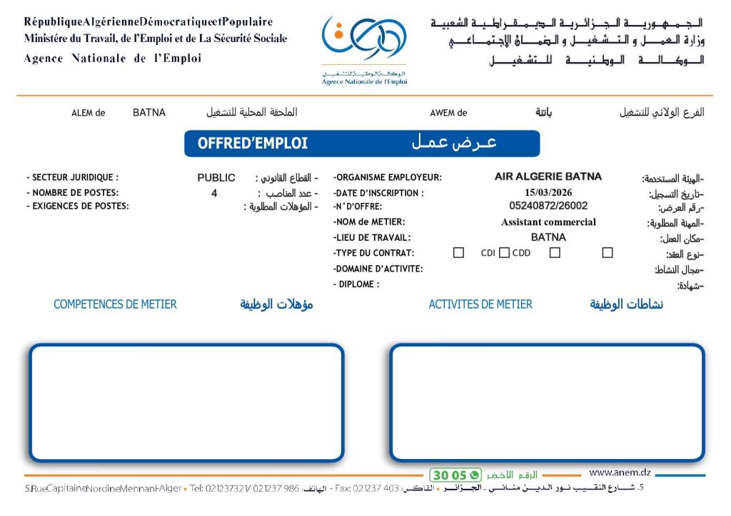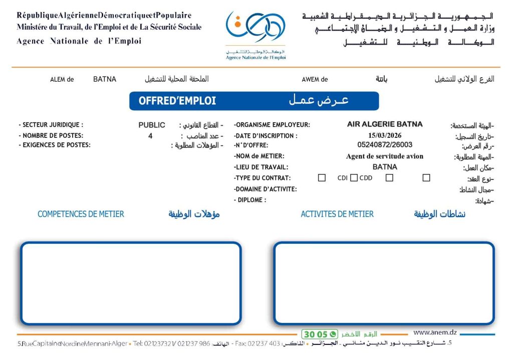 الهيئة المستخدمة: الخطوط الجوية الجزائرية – باتنة AIR ALGERIE BATNA