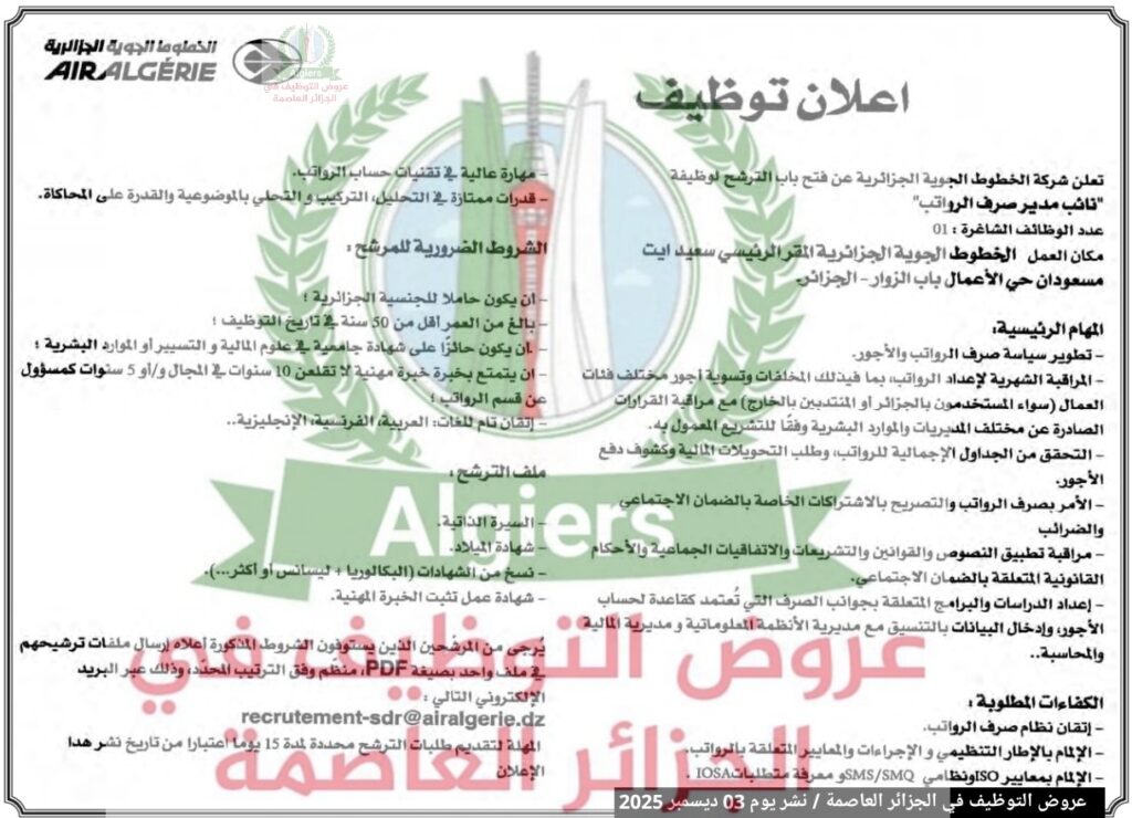 تعلن شركة الخطوط الجوية الجزائرية عن فتح باب الترشح لوظيفة نائب مدير صرف الرواتب.