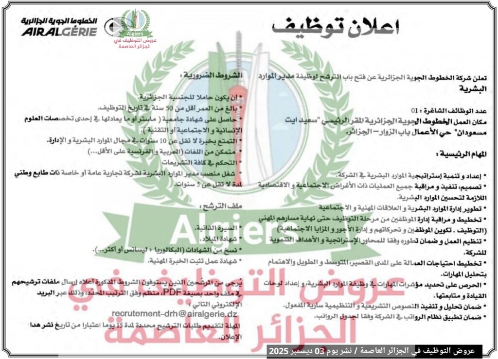 تعلن شركة الخطوط الجوية الجزائرية عن فتح باب الترشح لوظيفة مدير الموارد البشرية.