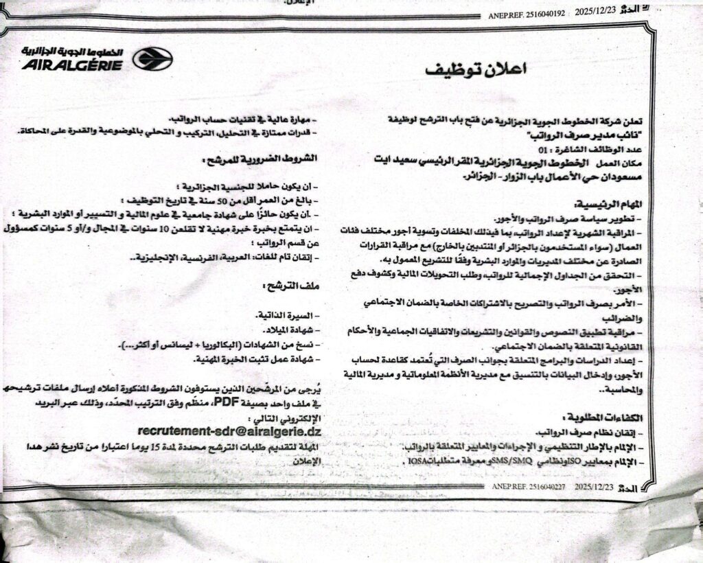 يُرجى من المترشحين الذين يستوفون الشروط إرسال ملف ترشح واحد بصيغة PDF، منظم حسب الترتيب المطلوب، عبر البريد الإلكتروني التالي:recrutement-sdr@airalgerie.dz
