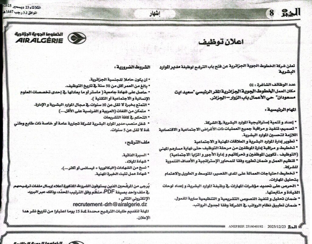 تعلن شركة الخطوط الجوية الجزائرية عن فتح باب الترشح