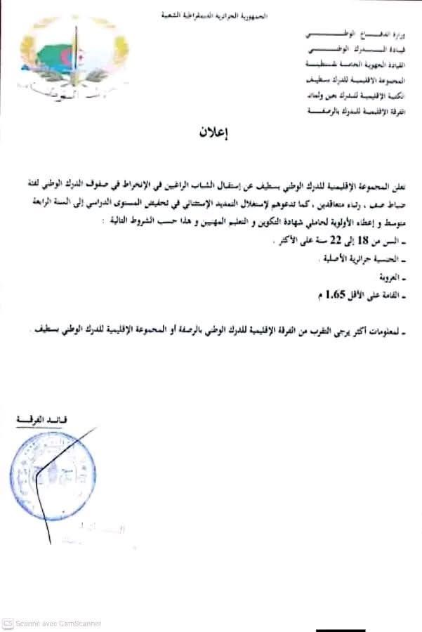 تعلن المجموعة الإقليمية للدرك الوطني بسطيف عن استقبال الشباب الراغبين في الانخراط في صفوف الدرك الوطني لفئة ضباط صف، رتباء متعاقدين، كما تدعوهم لاستغلال التمديد الاستثنائي في تخفيض المستوى الدراسي إلى السنة الرابعة متوسط و إعطاء الأولوية لحاملي شهادة التكوين و التعليم المهنيين و هذا حسب الشروط التالية: