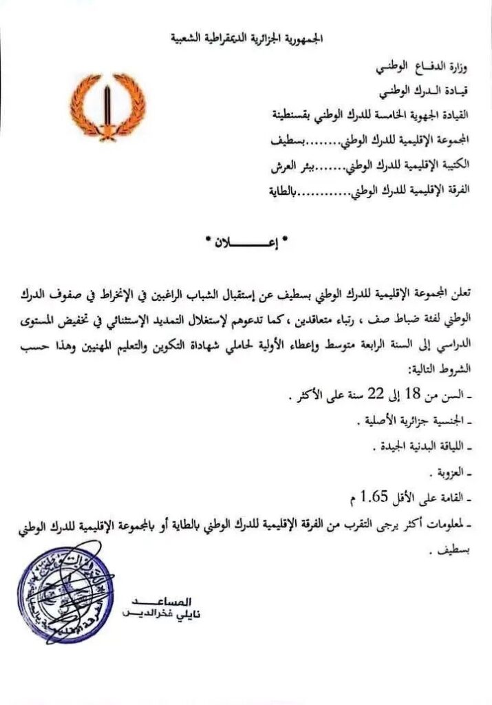تعلن المجموعة الإقليمية للدرك الوطني بسطيف عن استقبال الشباب الراغبين في الانخراط في صفوف الدرك الوطني لفئة ضباط صف، رتباء متعاقدين، كما تدعوهم لاستغلال التمديد الاستثنائي في تخفيض المستوى الدراسي إلى السنة الرابعة متوسط وإعطاء الأولوية لحاملي شهادات التكوين والتعليم المهنيين وهذا حسب الشروط التالية: