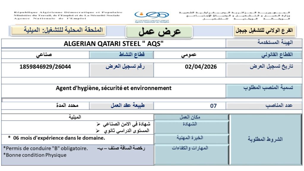 | الهيئة المستخدمة | ALGERIAN QATARI STEEL “AQS” |