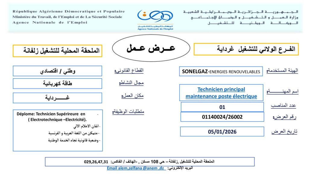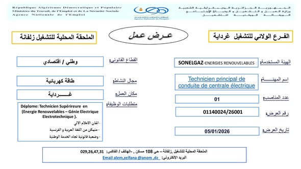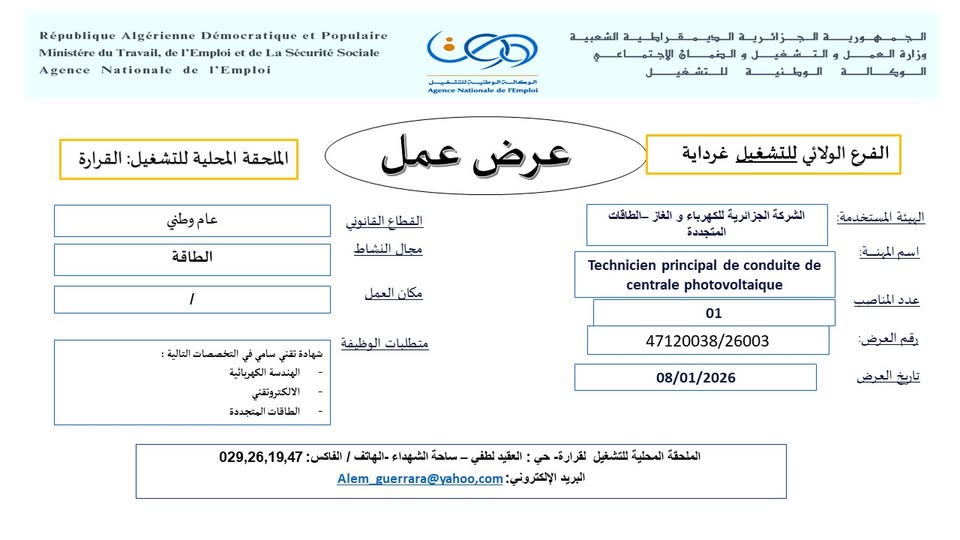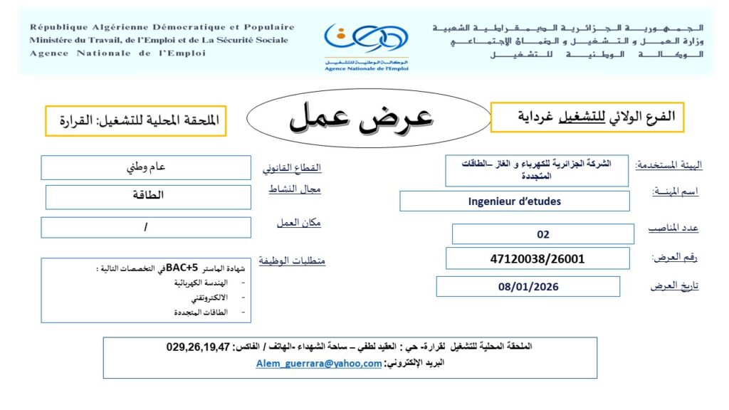 – يتم معالجة عروض العمل آليًا عبر النظام المعلوماتي لوسيط التشغيل مع الملحقات المحلية للتشغيل بولاية غرداية.