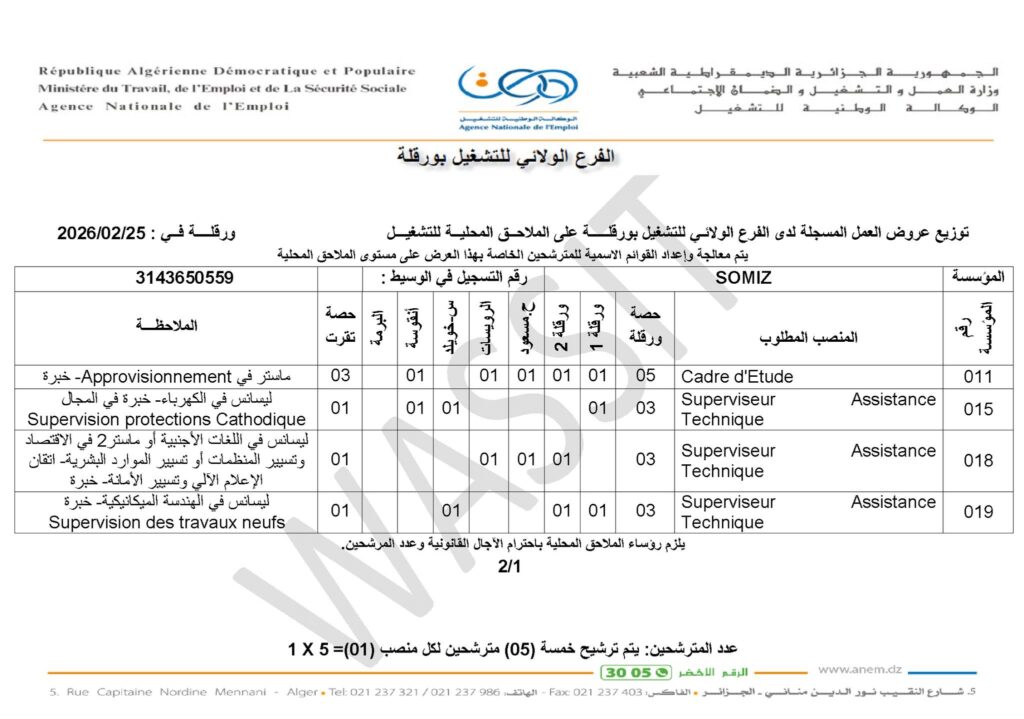 | 018 | Superviseur Assistance Technique | 04 | ليسانس في اللغات الأجنبية أو ماستر 2 في الاقتصاد وتسيير المنظمات أو تسيير الموارد البشرية – إتقان الإعلام الآلي وتسيير الأمانة – خبرة |