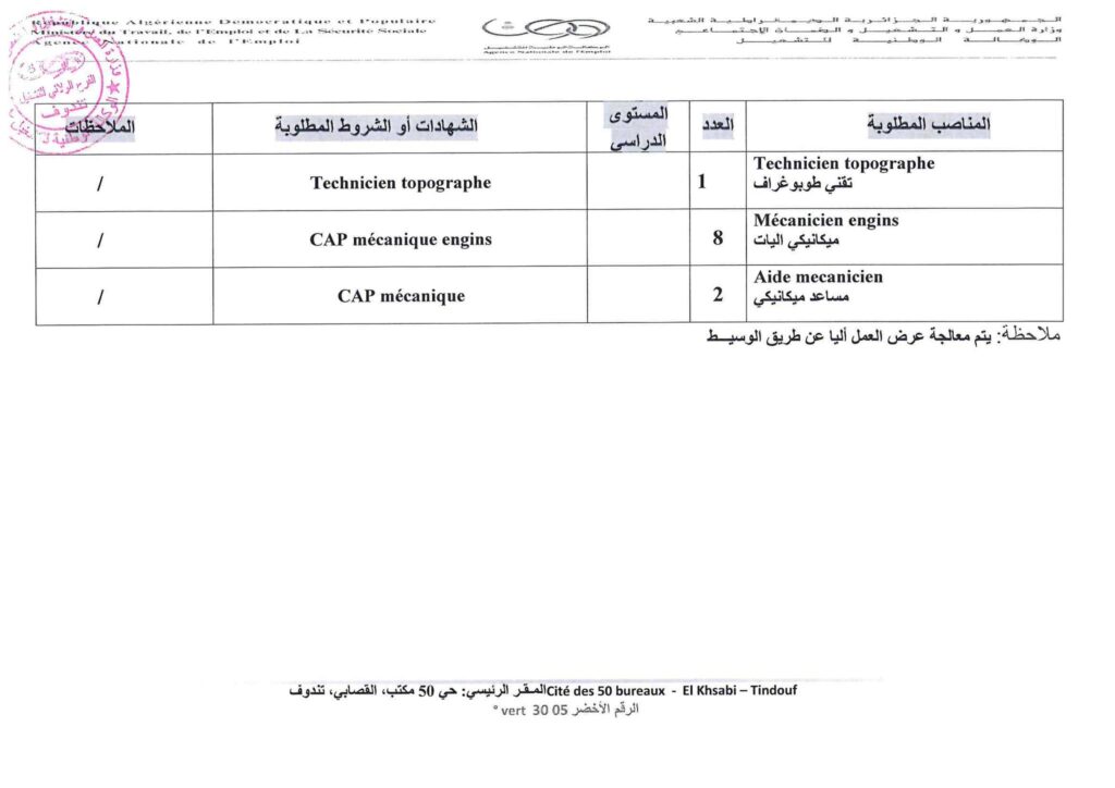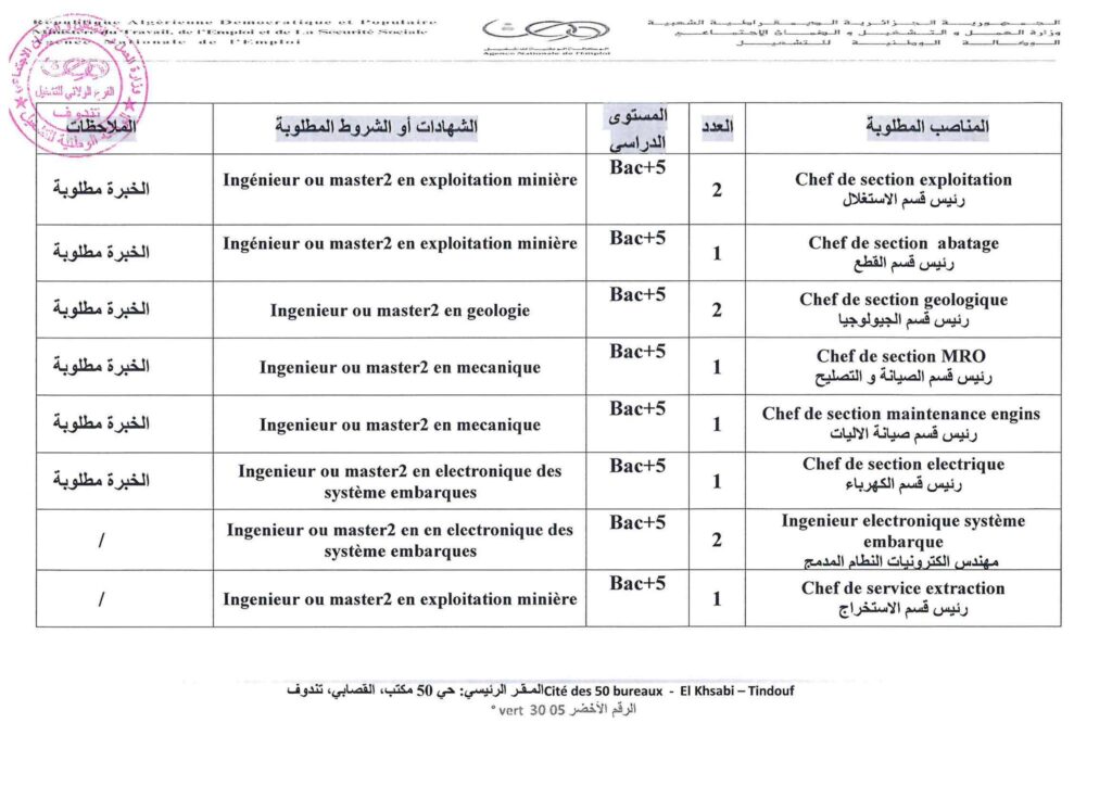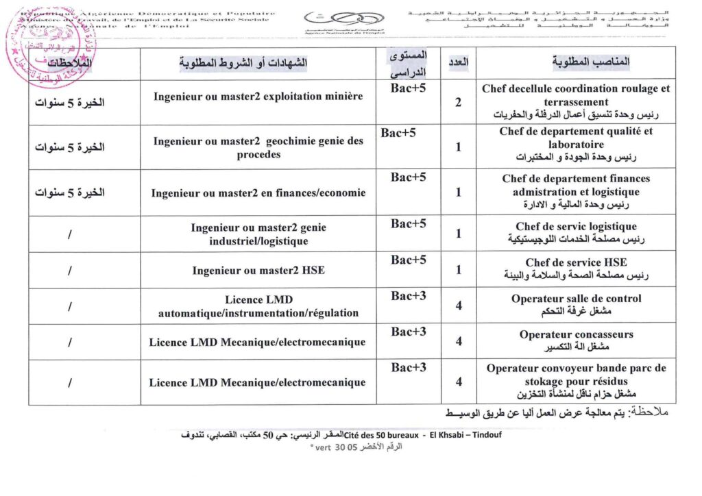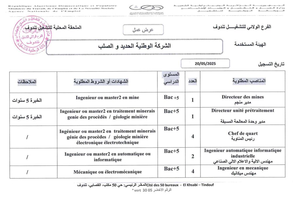 تعلن الشركة الوطنية الحديد والصلب عن فتح مناصب عمل للجامعيين ولغير الجامعيين بتندوف في التخصصات المتاحه