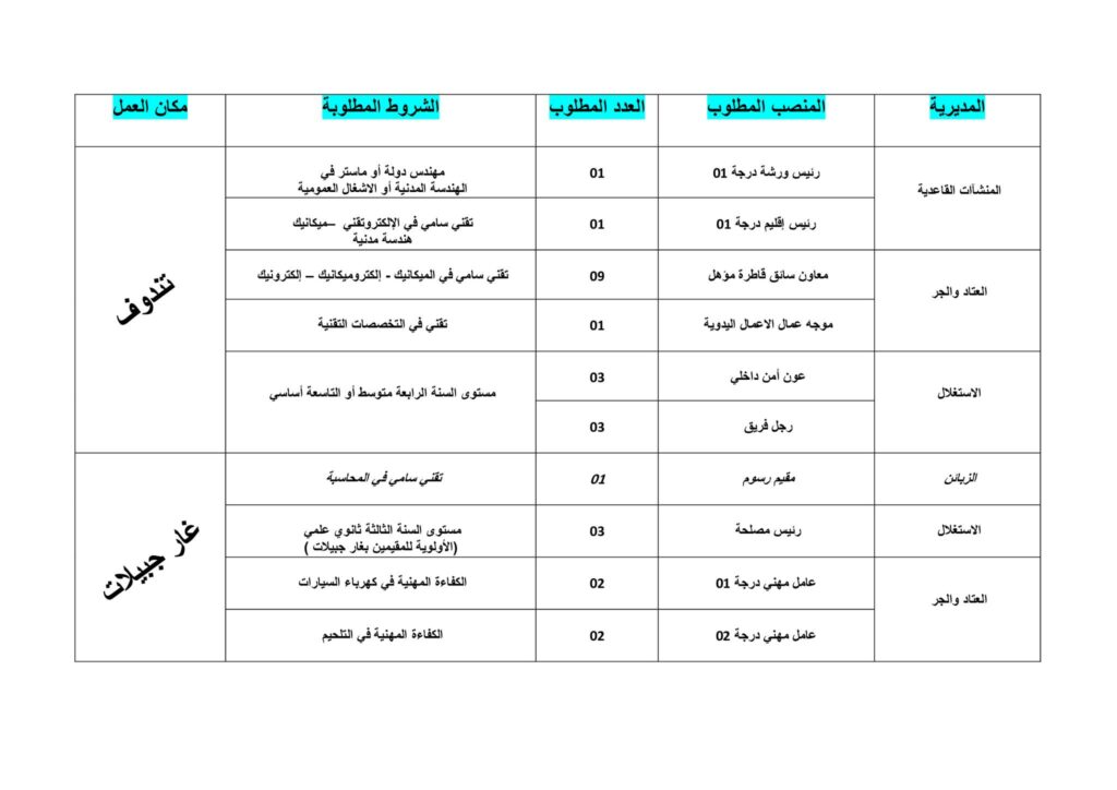 | الاستغلال | رئيس مصلحة | 01 | حسب متطلبات المنصب | غار جبيلات |