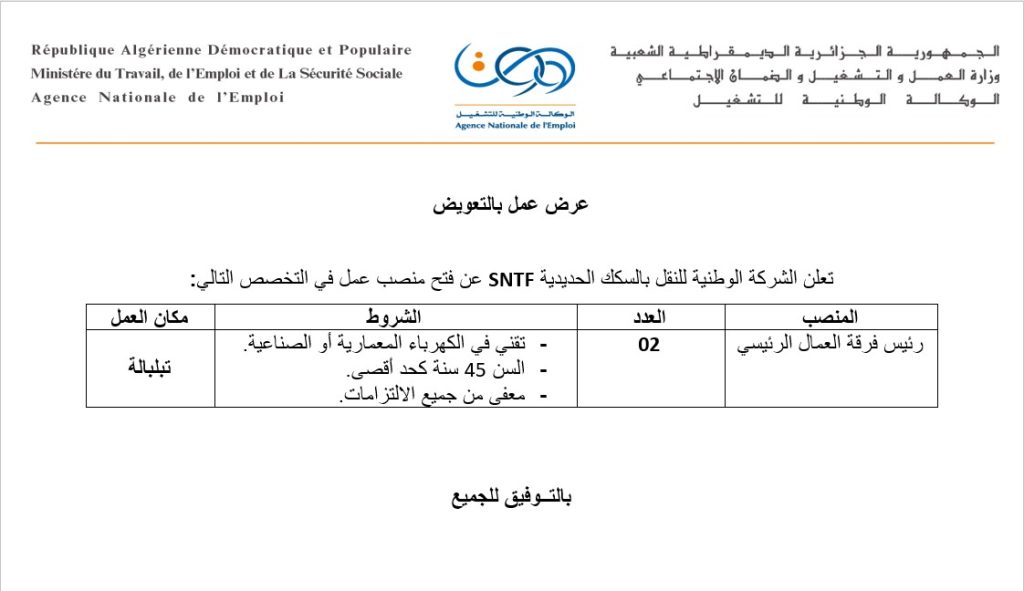 تعلن الشركة الوطنية للنقل بالسكك الحديدية SNTF عن فتح منصب عمل في التخصص التالي: