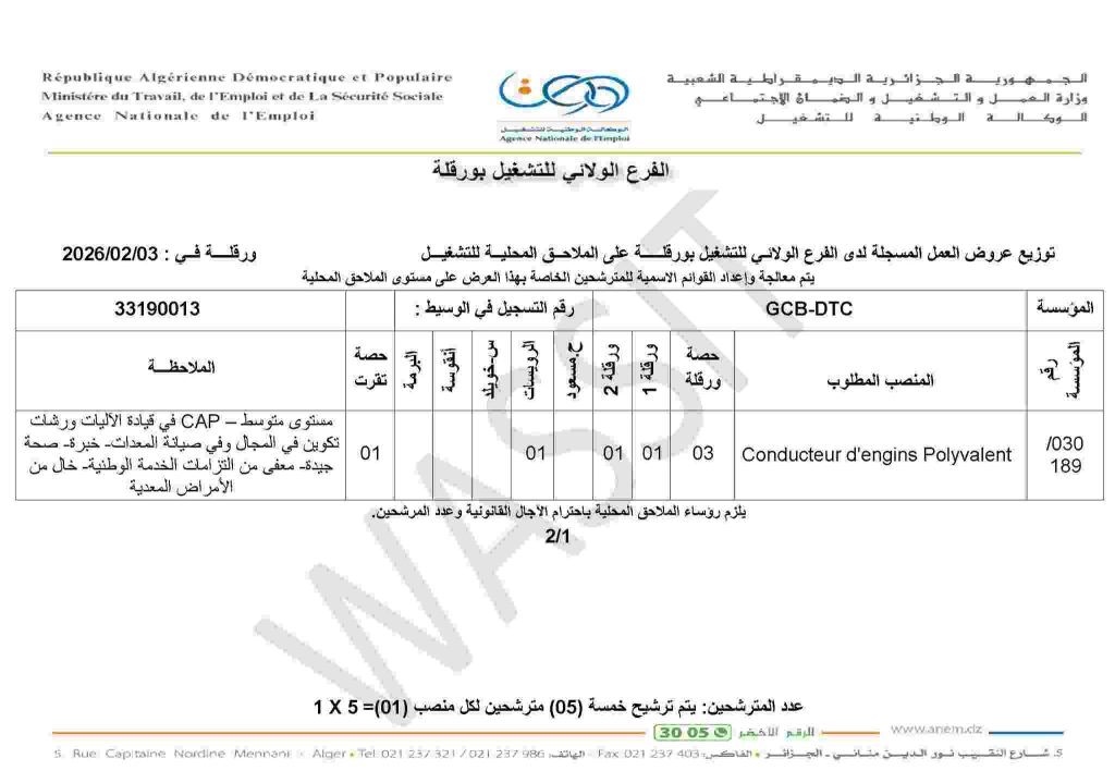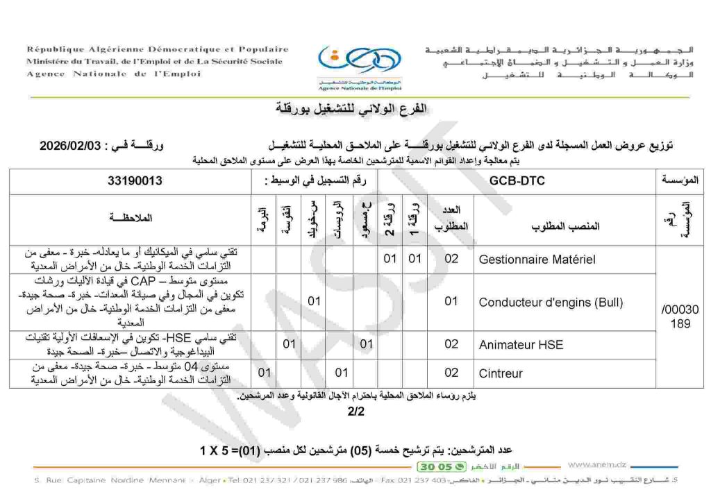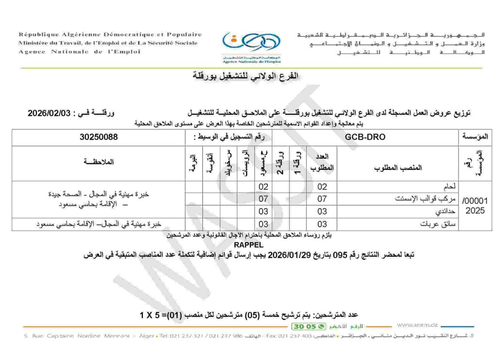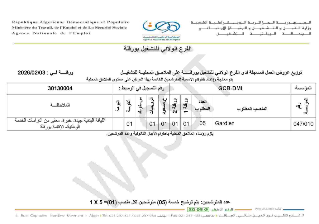 • الملاحظة: اللياقة البدنية جيدة – خبرة – معفى من التزامات الخدمة الوطنية – الإقامة بورقلة.