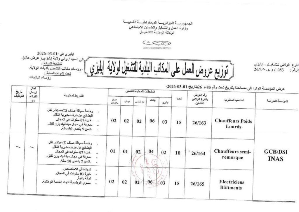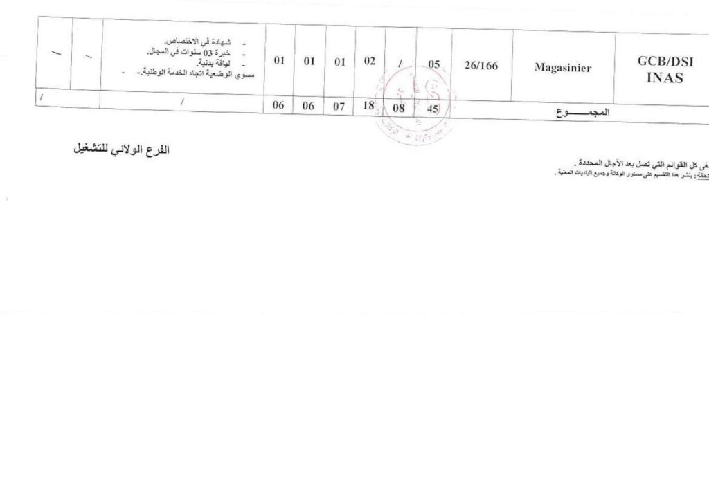 | Magasinier | 05 | 26/166 | 02 (إيليزي)، 01، 01، 01 | شهادة في الاختصاص، خبرة 03 سنوات، لياقة بدنية، تسوية الوضعية تجاه الخدمة الوطنية. |
