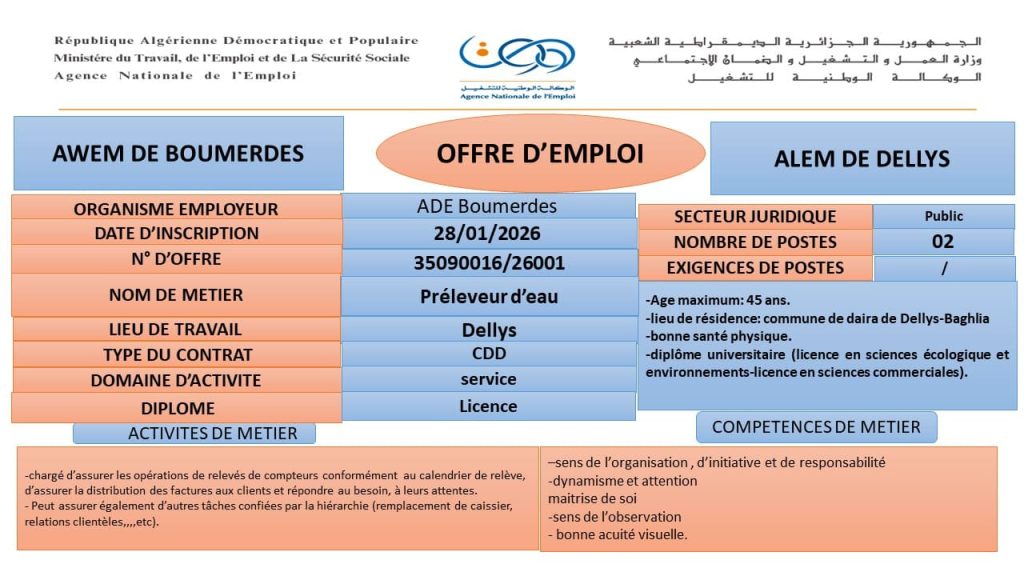 الهيئة المستخدمة: الجزائرية للمياه – بومرداس
