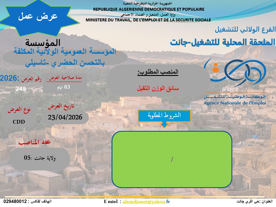 تفاصيل عروض العمل المعلن عنها من طرف الوكالة الوطنية للتشغيل (ANEM) – الملحقة المحلية للتشغيل جانت، لفائدة “المؤسسة العمومية الولائية المكلفة بالتحسين الحضري – تاسيلي”: