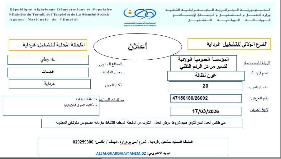 على طالبي العمل الذين تتوفر فيهم شروط عرض العمل، التقرب من الملحقة المحلية للتشغيل بغرداية مصحوبين بالوثائق المطلوبة.