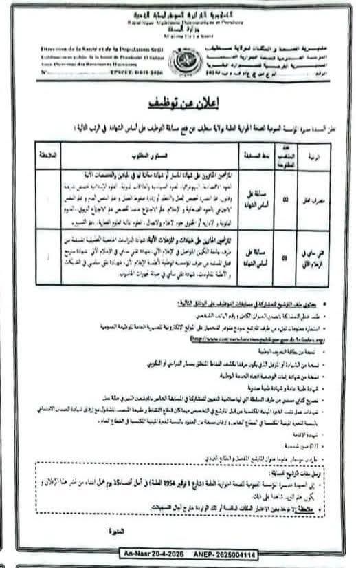 المؤسسة العمومية للصحة الجوارية بسطيف تعلن عن فتح مسابقة التوظيف