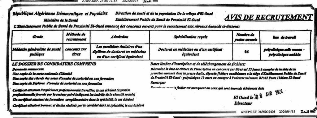 يحدد تاريخ اختتام التسجيلات في المسابقة على أساس الشهادات بـ 15 يوماً ابتداءً من تاريخ أول صدور للإعلان في الصحافة المكتوبة. تودع ملفات الترشح بمقر المؤسسة العمومية للصحة الجوارية بالوادي – العيادة المتعددة الخدمات 19 مارس، أو ترسل عبر البريد إلى العنوان التالي: ص.ب: 62 مكتب بريد 19 مارس – الوادي.