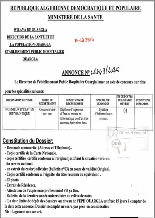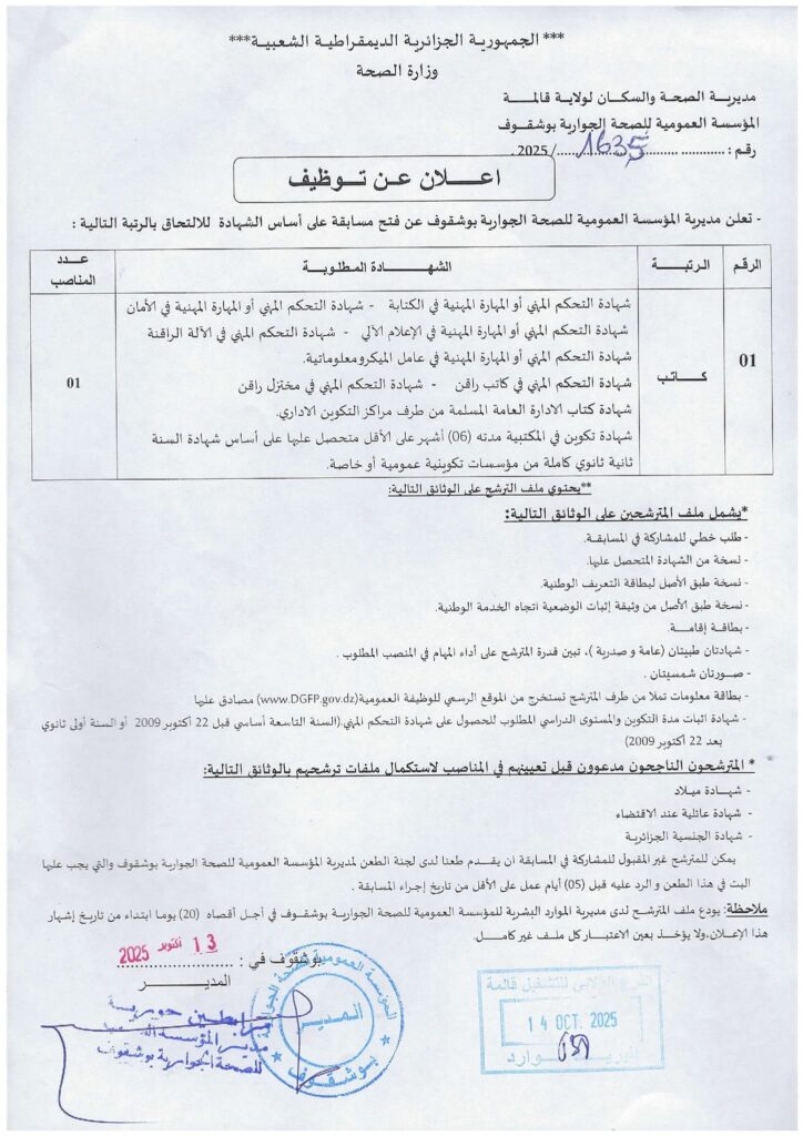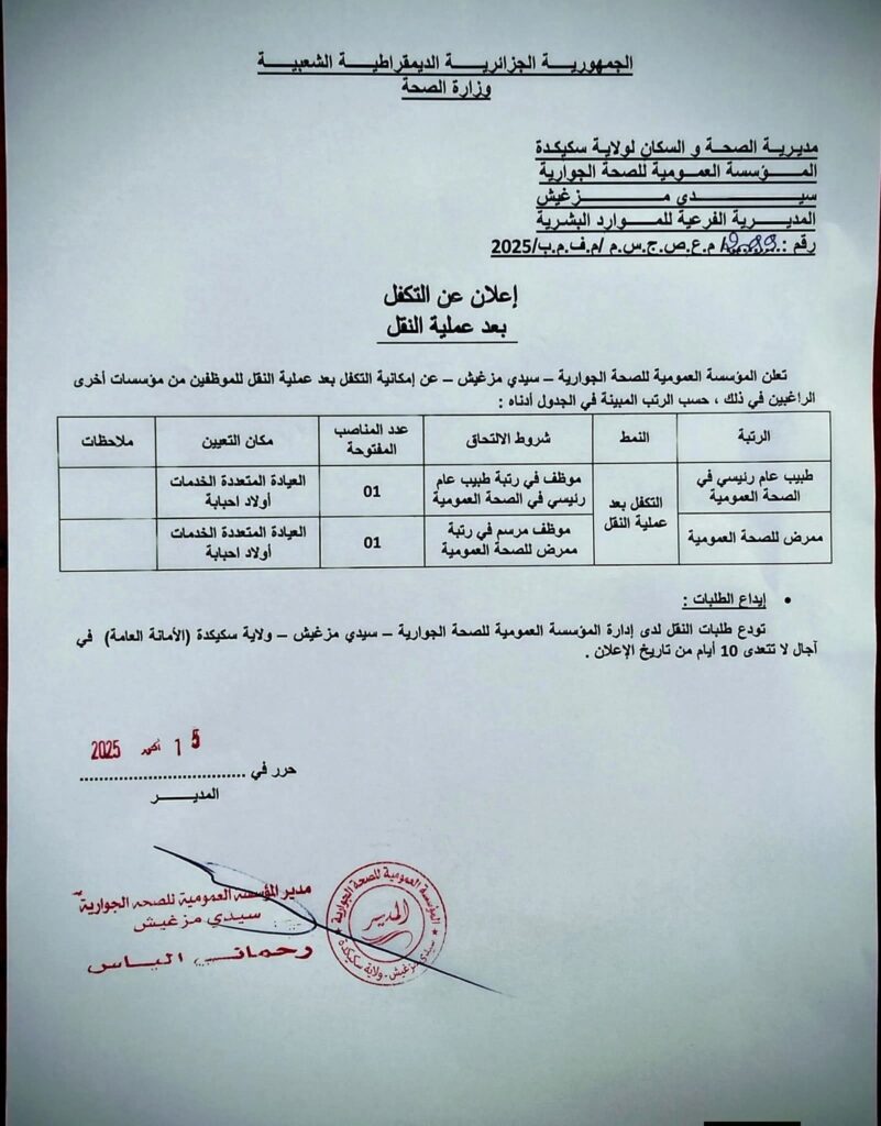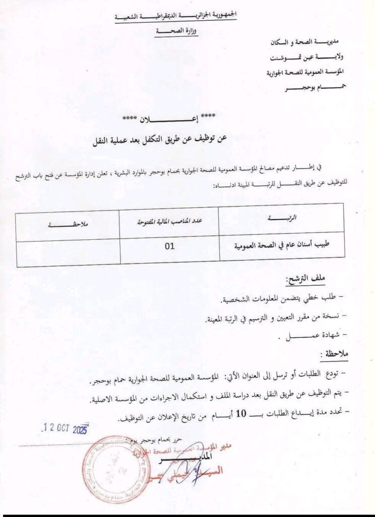 أعلنت المؤسسة العمومية للصحة الجوارية عن فتح مسابقات توظيف جديدة تهدف إلى تدعيم مختلف مصالحها بالكفاءات المؤهلة في مجالات الطب، التمريض، والإدارة الصحية. تأتي هذه الخطوة في إطار تحسين الخدمات الصحية وتقريبها من المواطن، وتجسيدًا لسياسة الدولة في تجديد الطاقات البشرية داخل قطاع الصحة العمومية.
