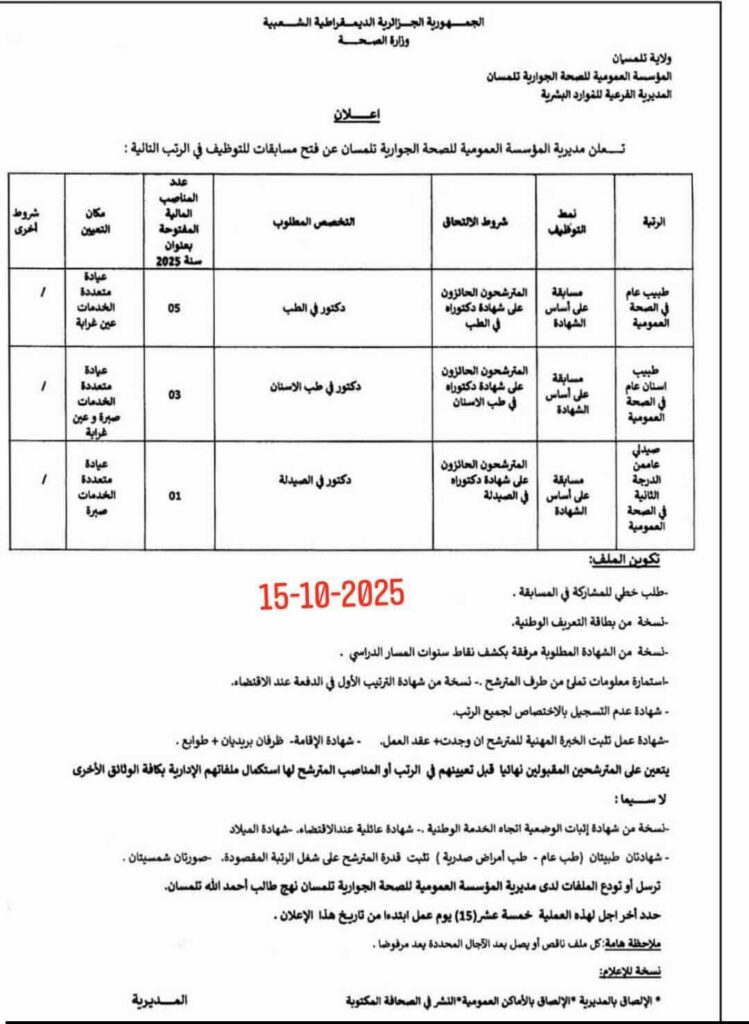 المؤسسة العمومية للصحة الجوارية تعلن عن مسابقات توظيف جديدة