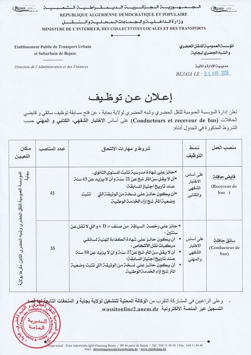 تعلن إدارة المؤسسة العمومية للنقل الحضري وشبه الحضري لولاية بجاية، عن فتح مسابقة توظيف سائقي وقابضي الحافلات (Conducteurs et receveur de bus) على أساس الاختبار الشفهي، الكتابي والمهني حسب الشروط المذكورة في الجدول أدناه: