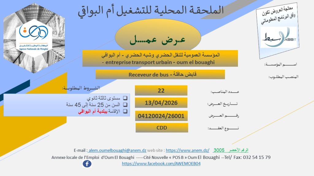 | قابض حافلة – Receveur de bus | 22 | 13/04/2026 | CDD | مستوى ثالثة ثانوي، السن من 25 سنة إلى 45 سنة، الإقامة ببلدية أم البواقي |