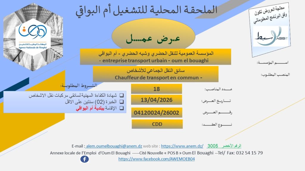 | سائق النقل الجماعي للأشخاص – Chauffeur de transport en commun | 18 | 13/04/2026 | CDD | شهادة الكفاءة المهنية لسائقي مركبات نقل الأشخاص، الخبرة (02) سنتين على الأقل، الإقامة ببلدية أم البواقي |