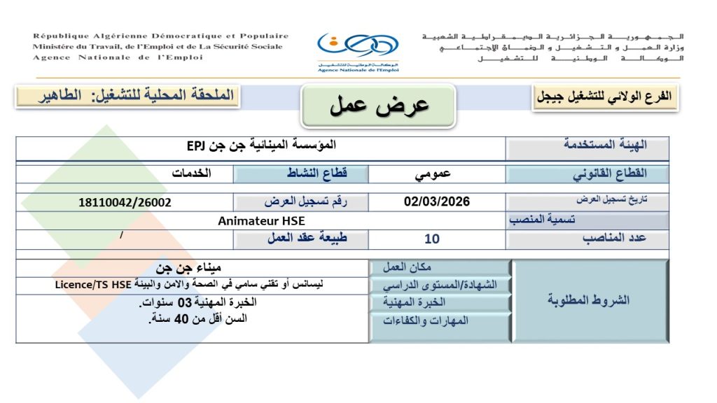 الهيئة المستخدمة: المؤسسة المينائية جن جن EPJ.