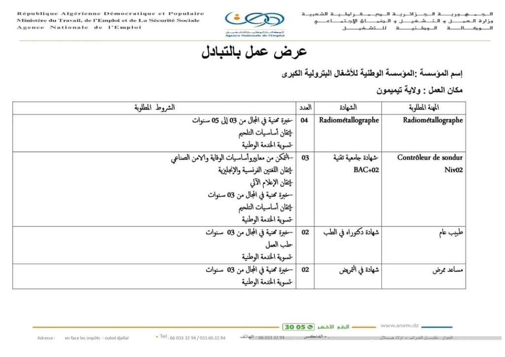 | Radiométallographe | Radiométallographe | 04 | – خبرة مهنية في المجال من 03 إلى 05 سنوات – إتقان أساسيات التلحيم – تسوية الخدمة الوطنية |