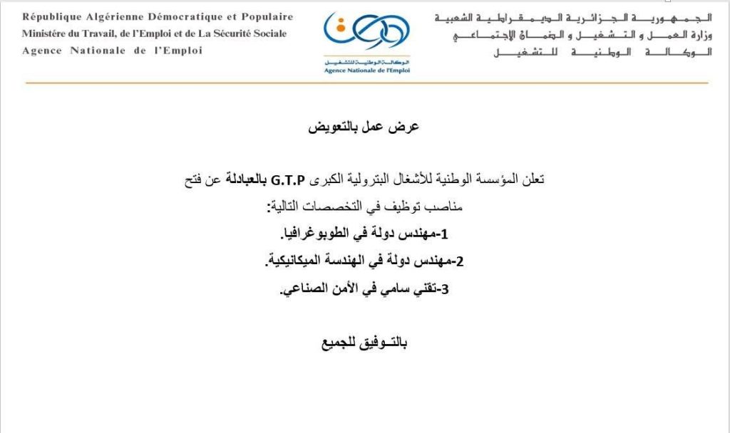 تعلن المؤسسة الوطنية للأشغال البترولية الكبرى G.T.P بالعبادلة عن فتح مناصب توظيف في التخصصات التالية: