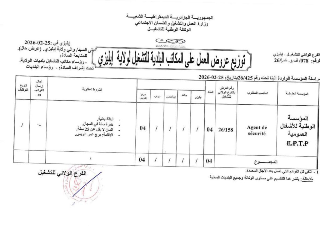 الموضوع: توزيع عروض العمل على المكاتب البلدية للتشغيل لولاية إيليزي.