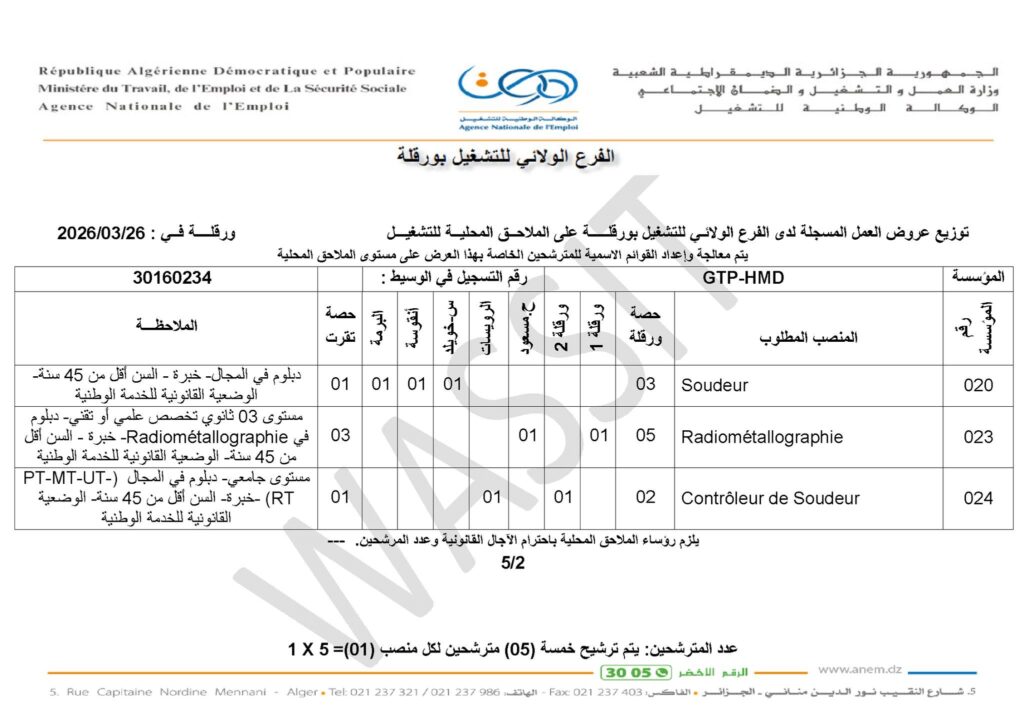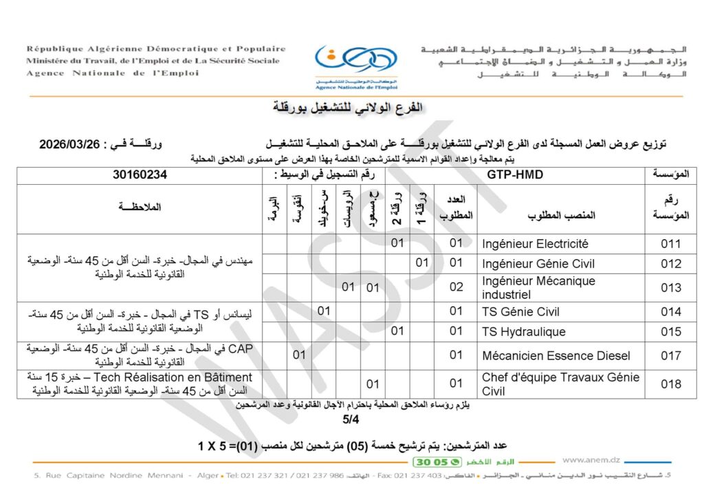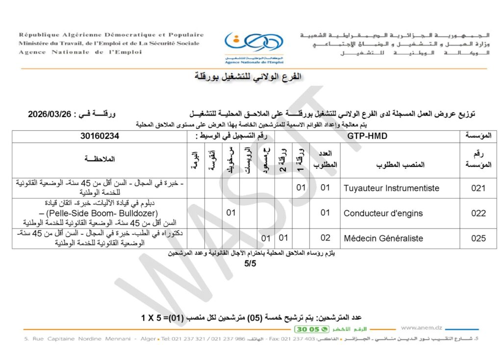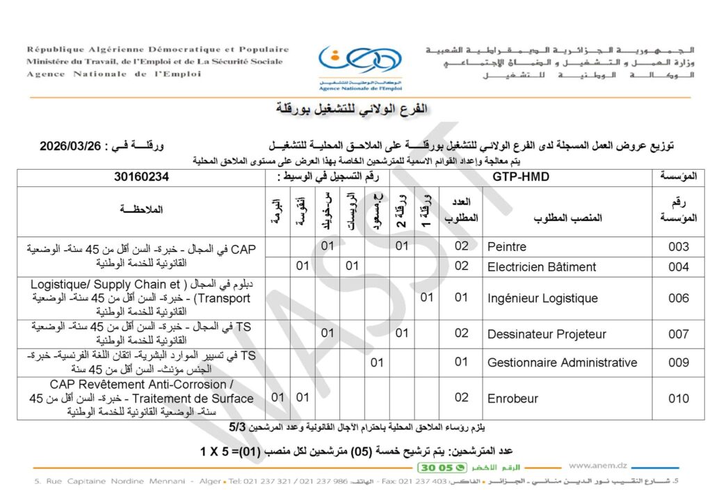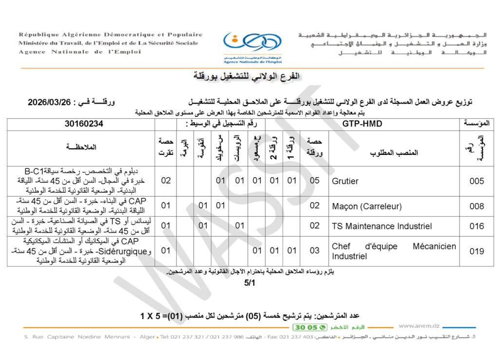 • يتم ترشيح خمسة (05) مترشحين لكل منصب عمل (1 × 5).