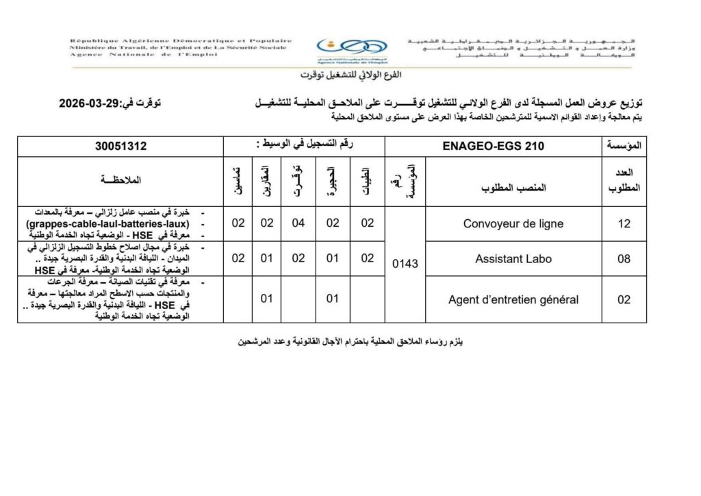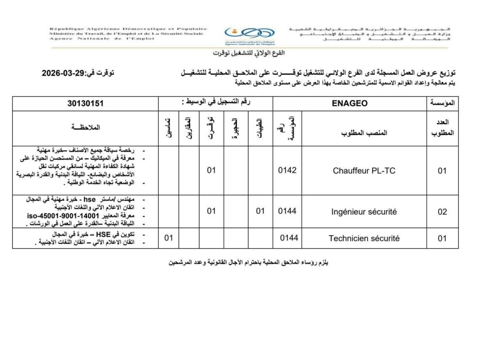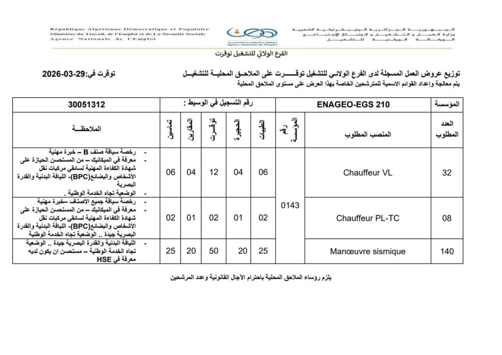 عبارة عن عروض عمل صادرة عن الوكالة الوطنية للتشغيل (ANEM) – الفرع الولائي للتشغيل بـ توقرت، لصالح شركة ENAGEO، بتاريخ 29 مارس 2026.