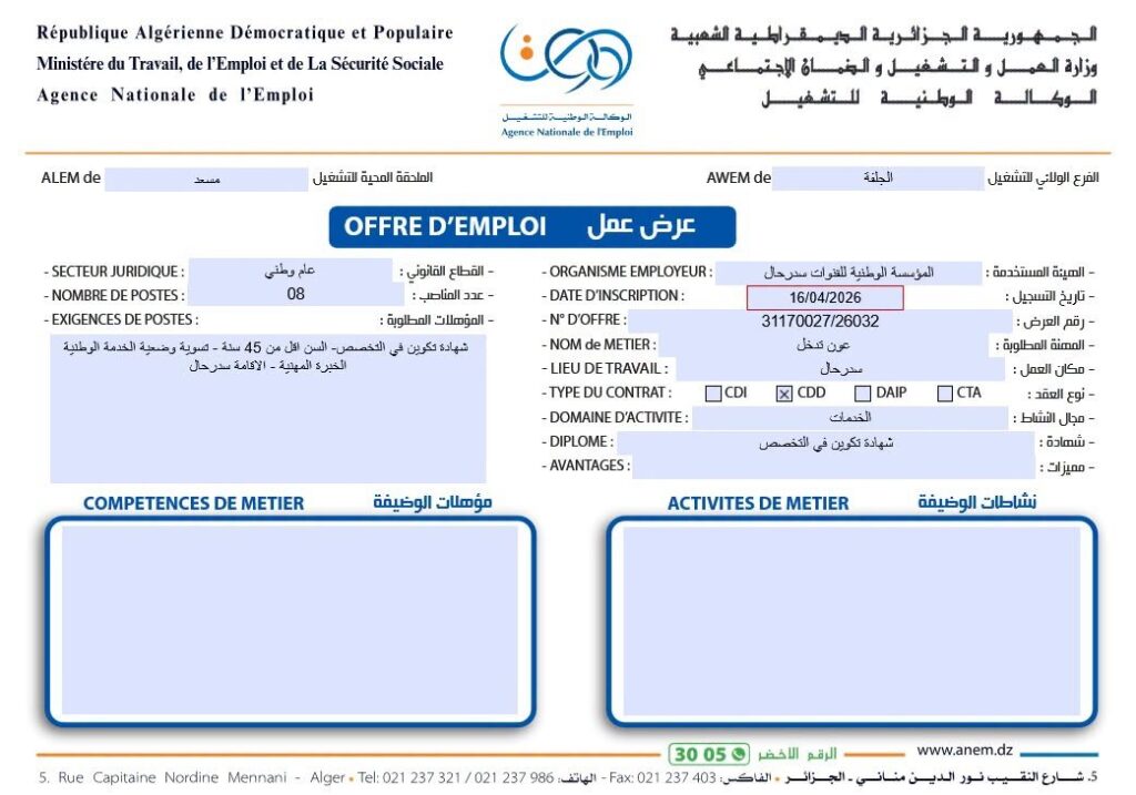 تفاصيل عرض العمل (OFFRE D’EMPLOI)