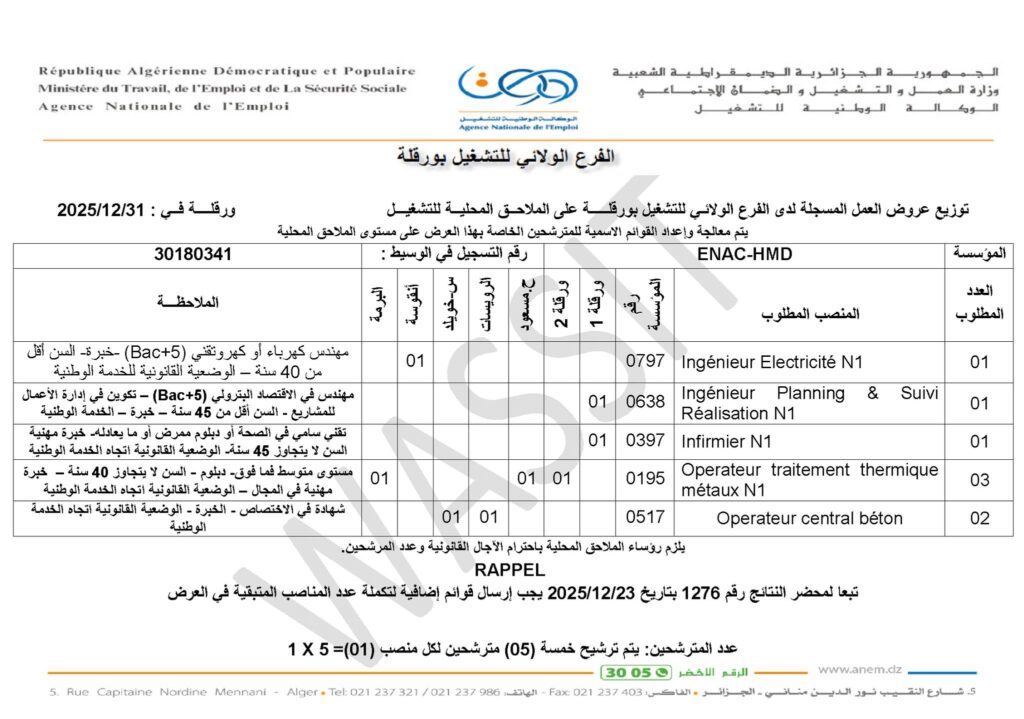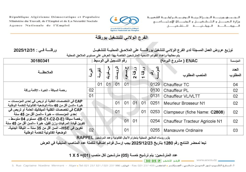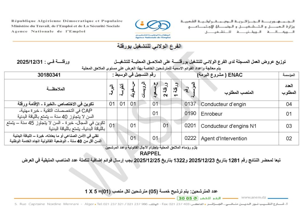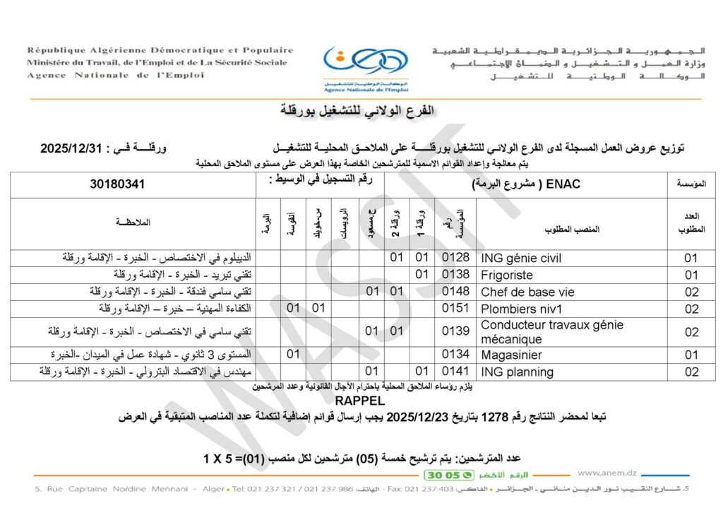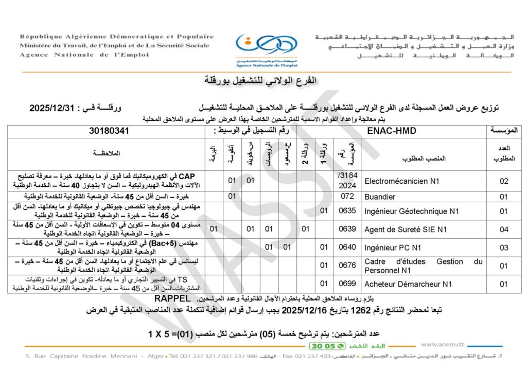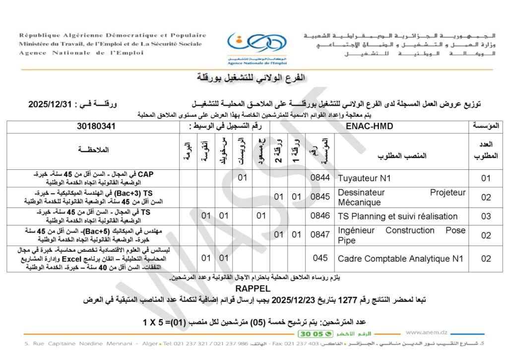 تعلن المؤسسة الوطنية للقنوات ENAC عن فتح باب توظيف في حاسي مسعود