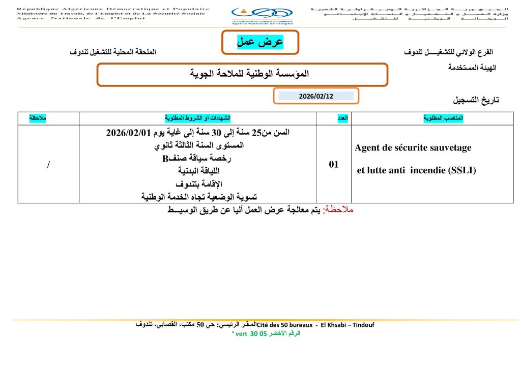 | Agent de sécurité sauvetage et lutte anti incendie (SSLI) | 01 | * السن من 25 سنة إلى 30 سنة إلى غاية يوم 2026/02/01 * المستوى السنة الثالثة ثانوي * رخصة سياقة صنف B * اللياقة البدنية * الإقامة بتندوف * تسوية الوضعية تجاه الخدمة الوطنية |