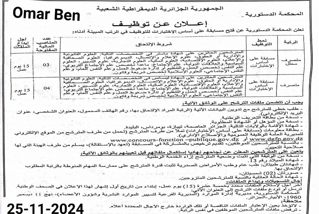 المحكمة الدستورية تعلن مسابقة توظيف بولايات الجزائر.البليدة.تيبازة.بومرداس